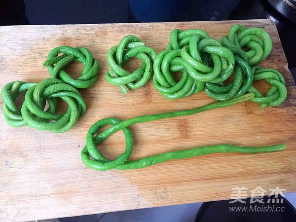 鍋里煮開水后加入5g鹽和10ml油放入豆角煮軟撈起放涼備用