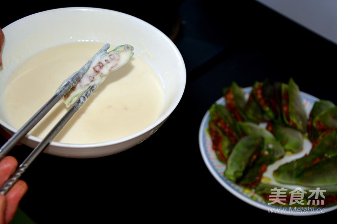 6.炒鍋熱油,將做好的肉餡豬耳朵豆角在面糊里粘一下裹滿面粉放進油鍋進行炸制。