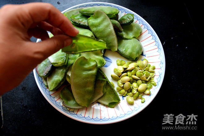 2.將豆角在較厚的一頭掰開,取出所有的豆子。