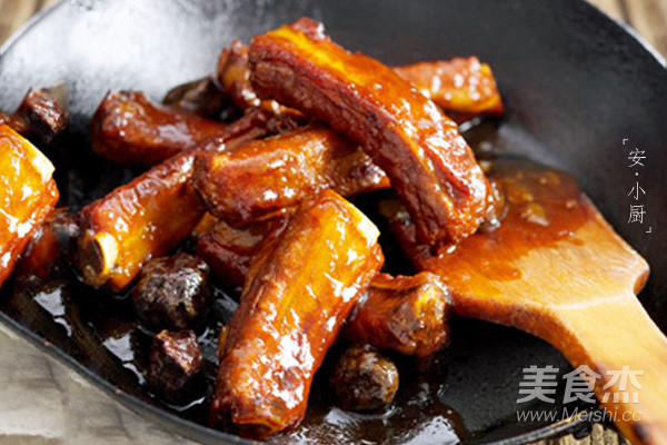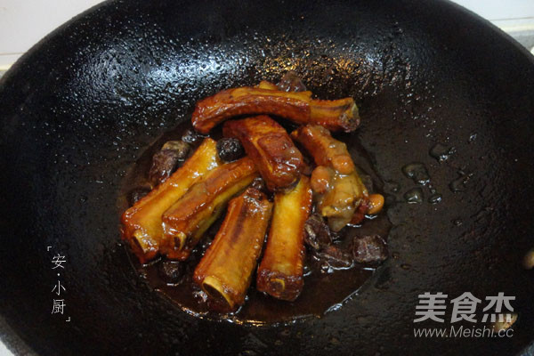 4.烹入黃酒,調(diào)入老抽翻炒均勻,然后注入足量熱水(剛好沒過排骨),投入蔥姜、肉桂、丁香、話梅,大火燒開煮10分鐘,然后加入冰糖、醋調(diào)成中火繼續(xù)煮20分鐘。