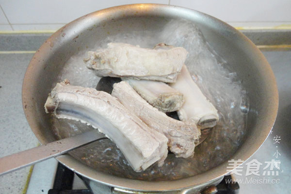 2.排骨(或脆骨小排)洗凈,放入鍋中,加入能夠沒過排骨的冷水,大火煮開,撈出排骨用熱水沖凈控干備用。香蔥洗凈打結(jié),老姜拍破備用。