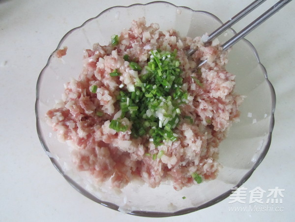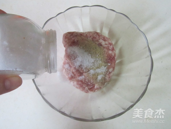 4.肉餡中加入點鹽、生姜粉、胡椒粉和料酒等調味料, 順著一個方向攪拌上勁;