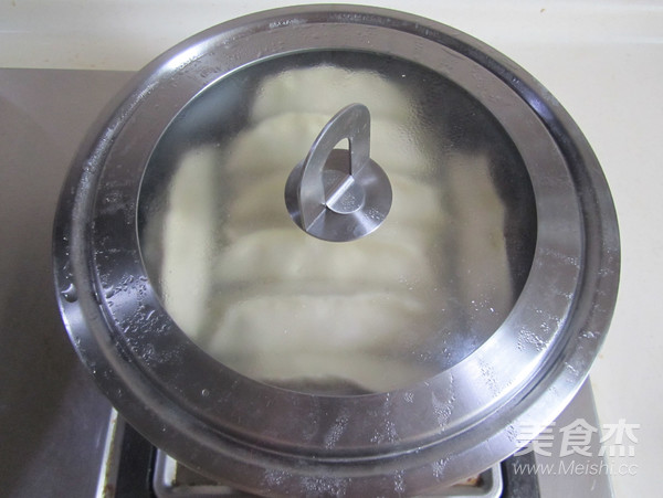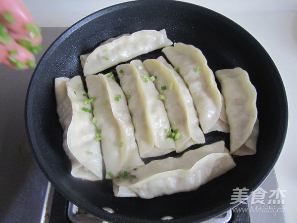 10.熱鍋放入少許油,將鍋貼放入鍋中煎一下, 再加入適量的水;