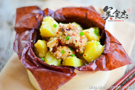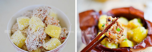 8.把裹好的排骨和土豆倒入碗里,上鍋中蒸制45分鐘左右即可