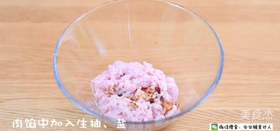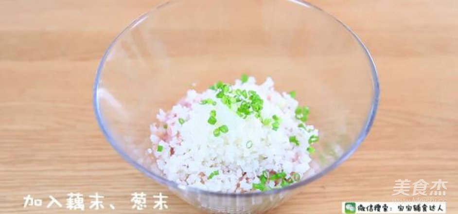 食材準備:豬肉餡130g、蓮藕60g、鵪鶉蛋1個、玉米淀粉2g、香蔥4g