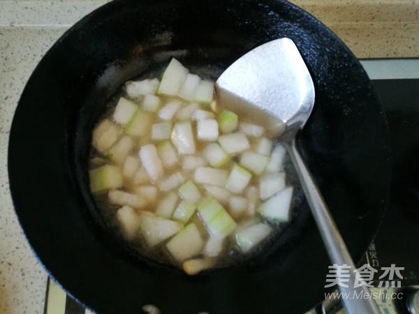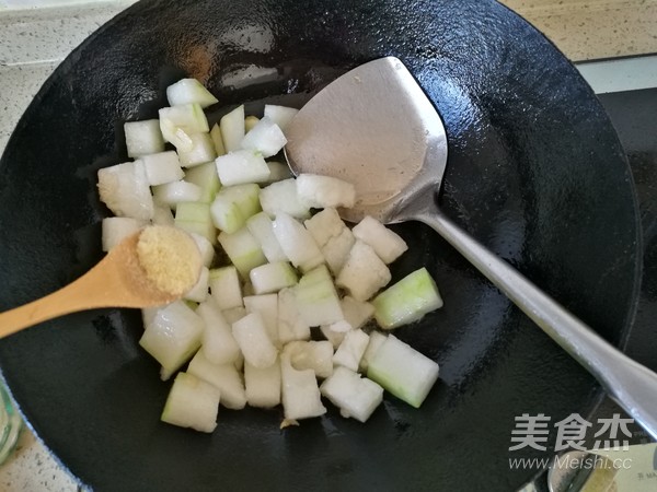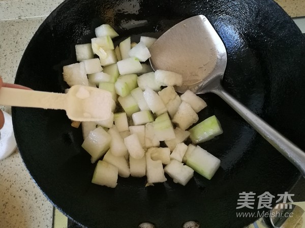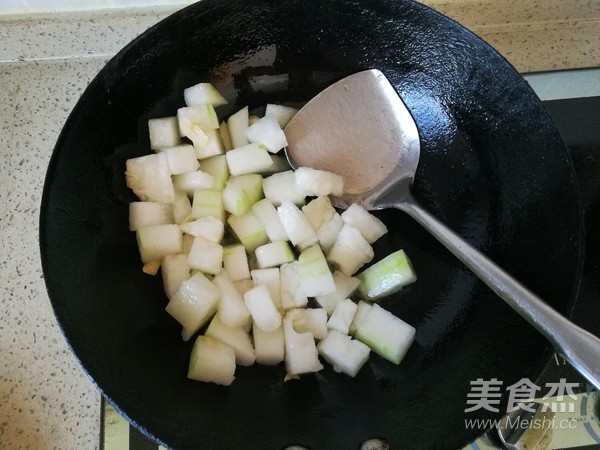 鍋燒熱,加入油,倒入蒜爆香后加入冬瓜翻炒。