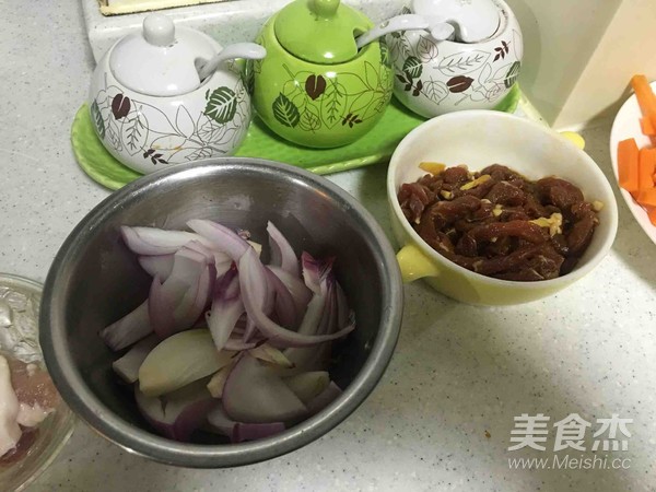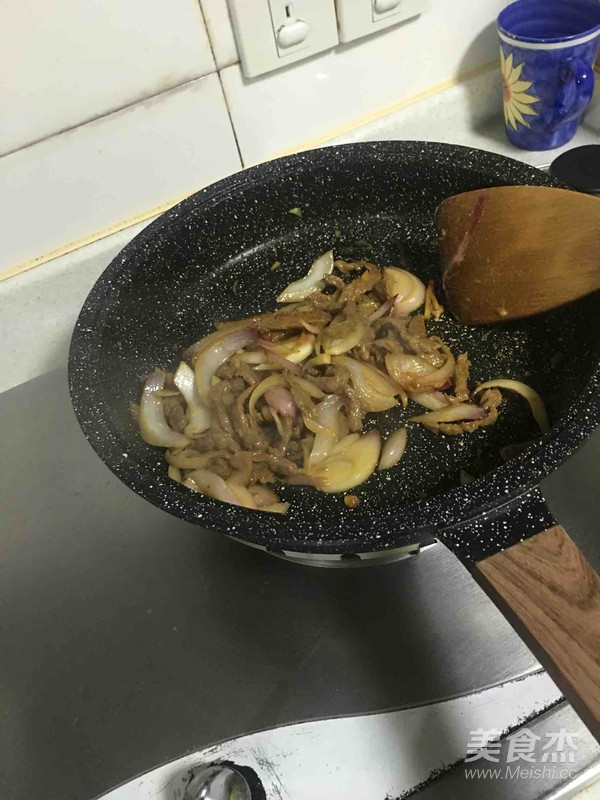 起油鍋倒入腌好的牛肉翻炒一分鐘后加入洋蔥。