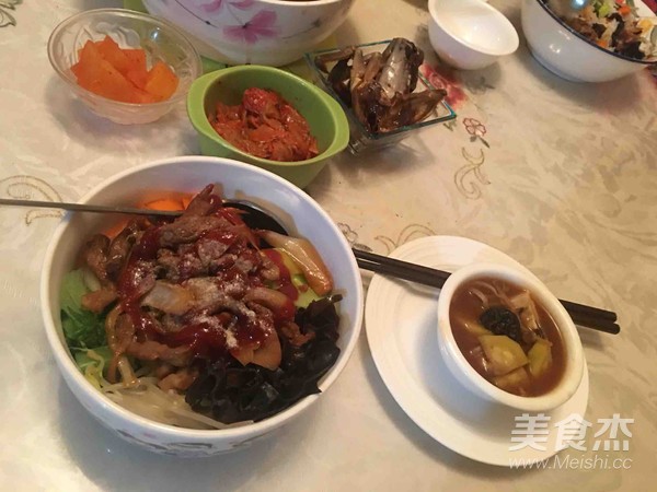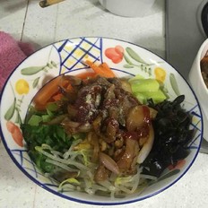 最后將洋蔥醬炒牛肉放在擺好的蔬菜中央。淋上韓國拌飯辣醬,撒上胡椒粉與白芝麻。
