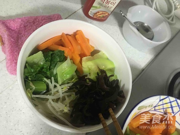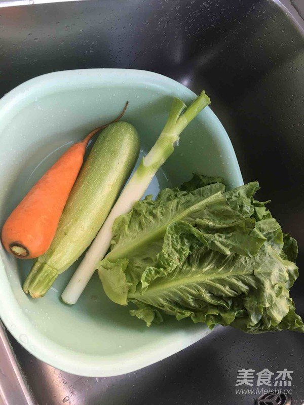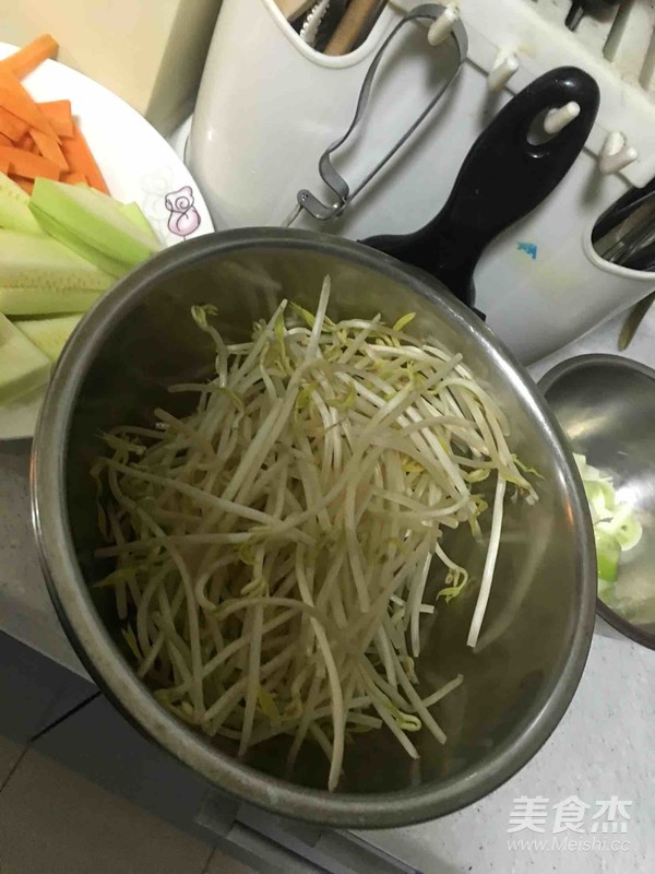 生菜切絲,西葫蘆和胡蘿卜切條狀,豆芽控干水,木耳切絲。