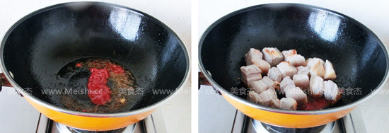 3.熱鍋冷油,放番茄醬炒出紅油,倒入焯好的五花肉