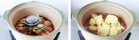 7.大火燒開,轉小火蓋上蓋子慢燉一小時左右,倒入土豆