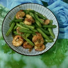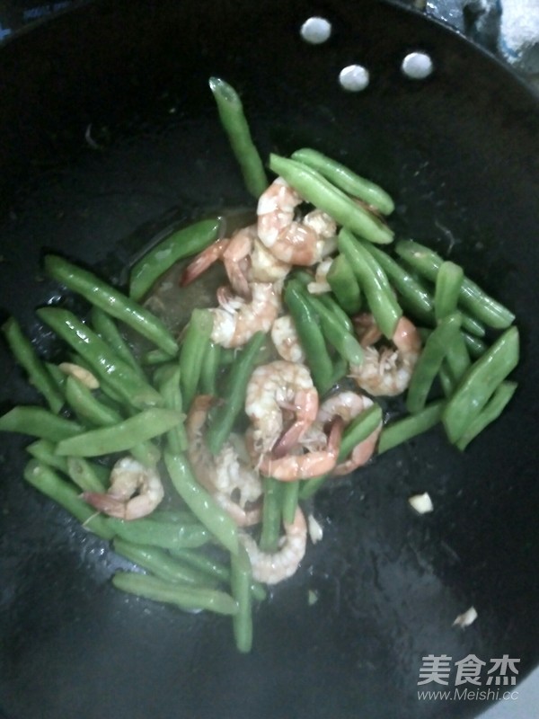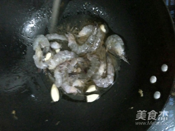 鍋熱下油,炒香蒜頭,倒入蝦仁大火翻炒