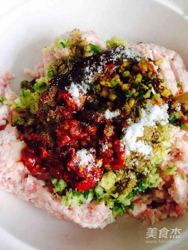 把豬肉剁碎,放入生姜,香蔥,蠔油,生抽,十三香,雞精,料酒,食鹽和豆瓣醬攪拌均勻