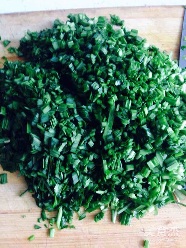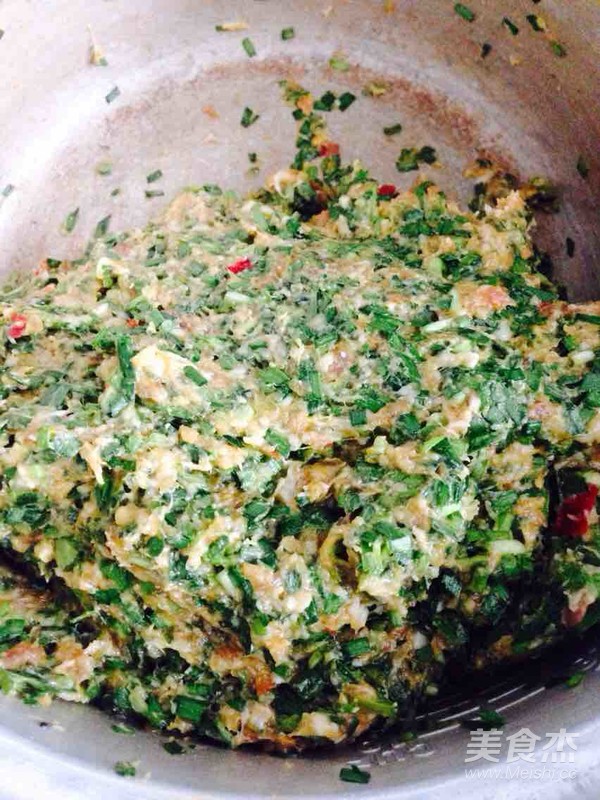 把韭菜倒入豬肉中 攪拌均勻,備用