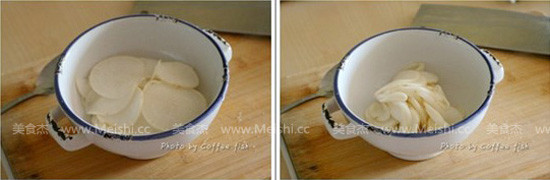 4.再鋪上一層白蘿卜片,再撒一層鹽,反復(fù)幾次,放15分鐘