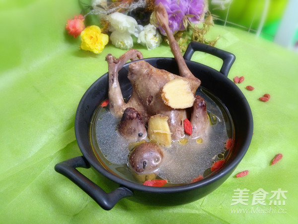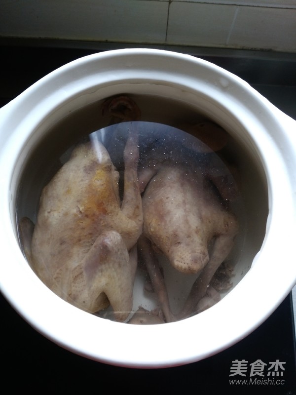 煮大約2小時,鴿子肉質軟爛,湯營養豐富。裝盤加調料享用。
