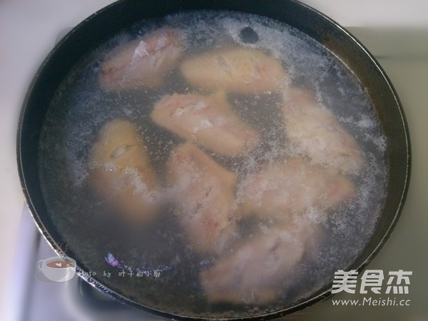 鍋里加入適量水,滴入加入適量料酒燒開,下入雞翅焯水,再次燒開煮一分鐘撈起瀝干水分