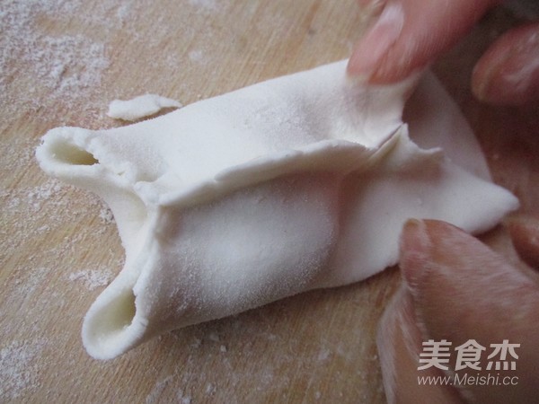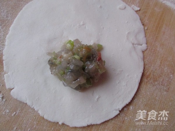 6.搟成圓皮,加入餡料,餡料靠一邊加,這樣金魚的身體比例就有了