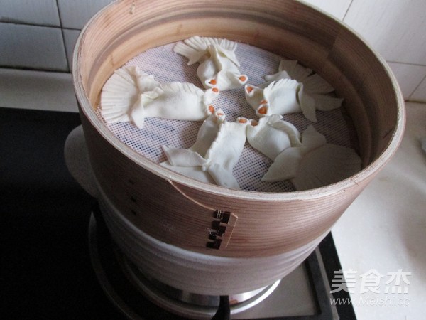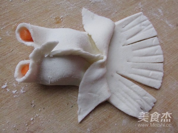 8.中間脊部和尾部用剪刀剪開,用牙簽壓出尾部的印子,胡蘿卜點綴眼睛