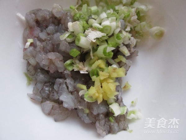 2.鮮蝦去皮成蝦仁剁碎,加蔥姜末