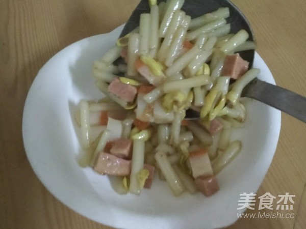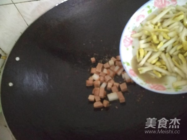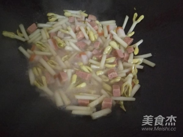 再將素燒肉放入鍋中炒,把花生苗放入去一齊炒