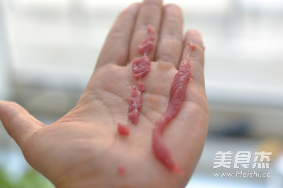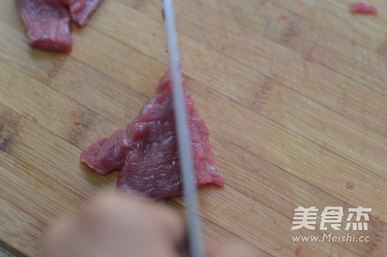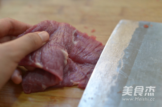 再順著牛肉的紋理切成5-6厘米長,3毫米左右寬的絲,有些朋友會疑問:“不是俗話說,橫切牛羊,豎切雞嗎?”原因看第6步