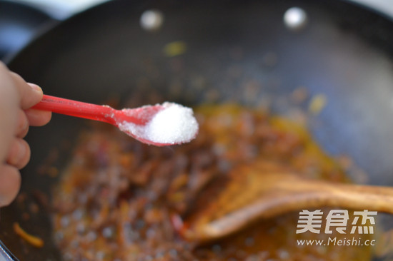加入1茶匙白糖,10克生抽,鹽和雞精適量,加糖為了調和口味,鹽和雞精酌情加,因為豆瓣醬和醬油已經很咸了,基本上加1/4茶匙鹽即可