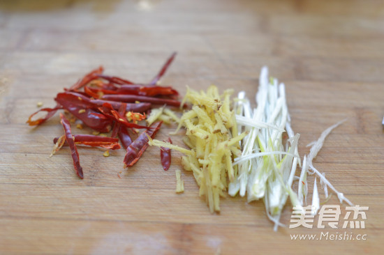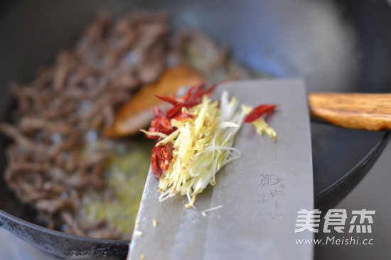 用鍋鏟推動肉絲肉絲比較松散并且有發硬的感覺,肉絲顏色變成深褐色;這時候倒入干辣椒絲,蔥姜絲炒出香味,這時候燃氣灶保持中火