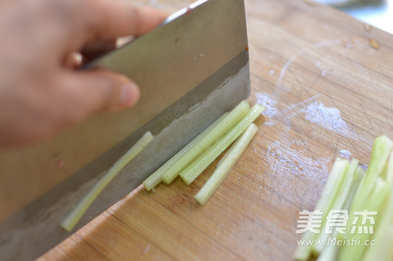 這時候放入芹菜絲,開大火翻炒幾下讓芹菜微微變軟即可,時間約一分鐘,芹菜炒老了也不好吃
