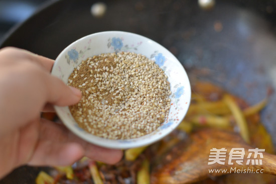 最后出鍋前撒上白芝麻、花椒粉和胡椒粉,花椒粉最后加麻味更加濃郁,加入了白芝麻味道更香,有吃牛肉干的感覺哦