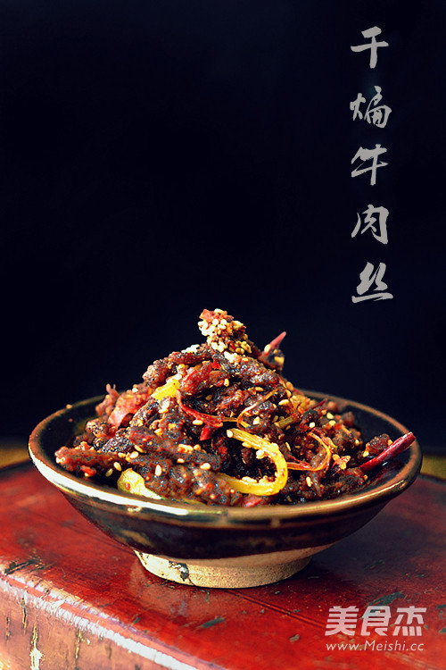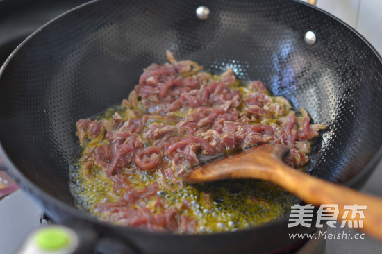油溫7成熱倒入牛肉絲,這個油溫要比平時炒肉絲的高一點,因為最后要把肉中的水分基本炒干