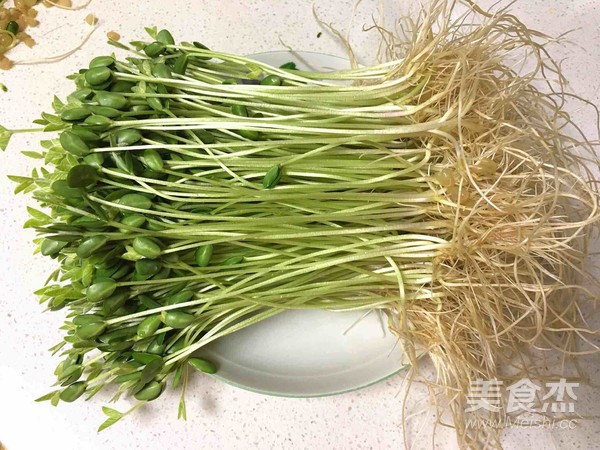 豆苗從育苗盒里采出(我的豆苗是自己種的,水培豆苗,非常簡單,撒下種子后,每天澆兩次水,一周后就可以吃了)