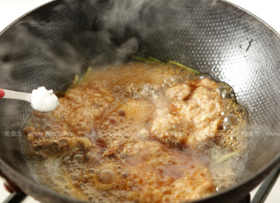 7.放入炸好的大排,調(diào)入白糖、老抽、生抽,加入適量開水,蓋上鍋蓋,小火燜煮20分鐘左右