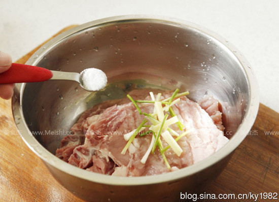 2.剁好的大排放入容器,加入蔥姜、鹽、料酒腌制30分鐘