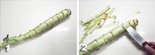 2.再將尾部細(xì)嫩的皮削干凈,只留下內(nèi)部青綠色的莖
