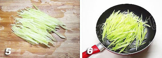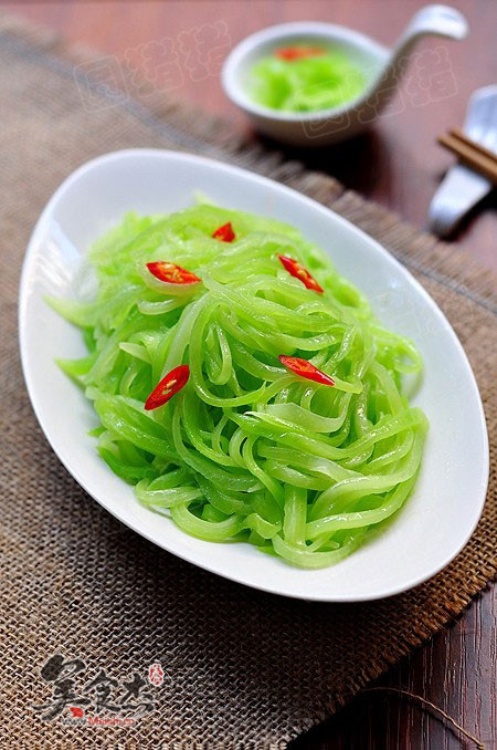 3.先斜切成大薄片,再切細(xì)絲;炒鍋里燒熱油,加入萵筍絲、鹽、雞精,用大火快速翻炒;直至萵筍絲變軟即可盛盤,最后用紅尖椒裝飾一下