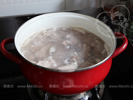 1.排骨涼水下鍋,不蓋鍋蓋煮開(用涼水是為了將排骨中的血水盡量煮出來, 不蓋鍋蓋是為了讓異味充分揮發)