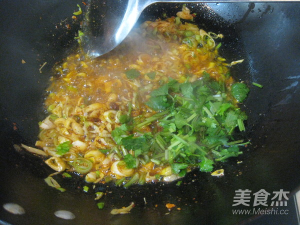 10.香菜根,每下入一個都翻炒勻,調入適量鹽,往炒鍋中倒入溫熱的羊肉湯,然后下入羊肉,煮開。