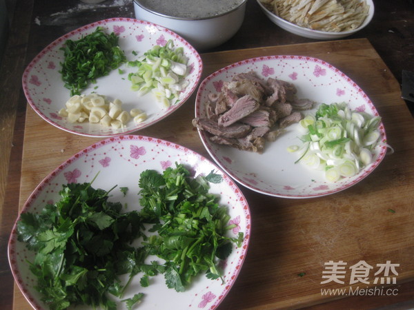 8.熟羊肉切片,蔥、蒜、香菜切碎,香菜根葉分開。