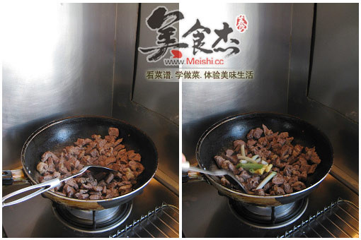 3.牛肉炒至變色、水分收干后,放入白酒、蔥段、姜片炒勻