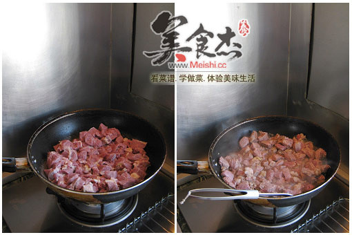 2.倒掉浸泡出的血水,將牛肉充分瀝干。鍋中加入少量油燒到3成熱,放入牛肉塊煸炒,中途會出水,此時將火力調大中火,繼續翻炒直到水分收干為止