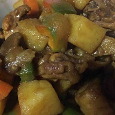 油燒熱,加白砂糖,不停攪拌,熬至焦糖色,加入雞塊翻炒