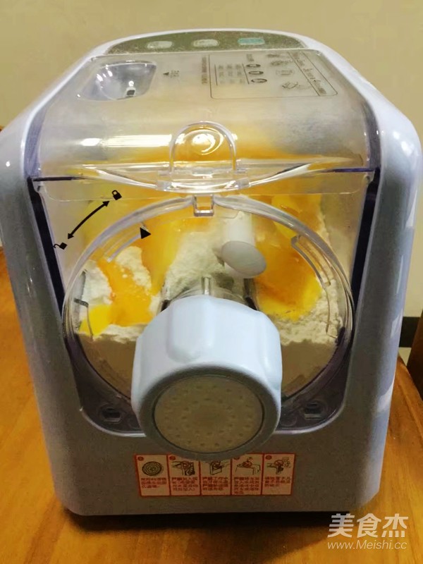 啟動(dòng)和面程序,邊和面邊加入蛋液