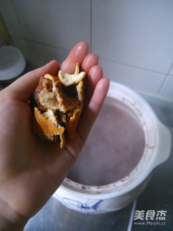 4.然后蓋上桿子小火慢慢的煮~我大概住了一個(gè)多小時(shí),小心溢鍋和粘鍋,然后加入洗干凈的陳皮