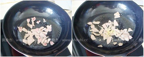 3.炒鍋重新放油加熱,將肉絲放進去炒至變色,加入姜蒜末同炒