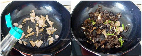 4.倒進少許生抽調味,放入木耳和蒜薹翻炒至熟