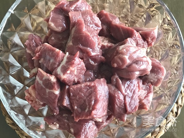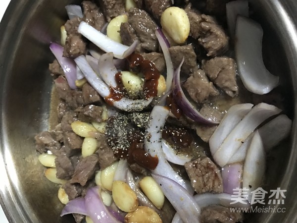 腌好的牛肉粒擇去洋蔥絲和姜絲。