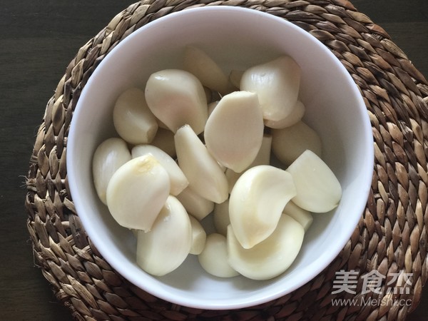 鍋內(nèi)放適量油,用量大概能沒過蒜粒一半的樣子,用小火將蒜粒煎至四面發(fā)黃,盛出備用。