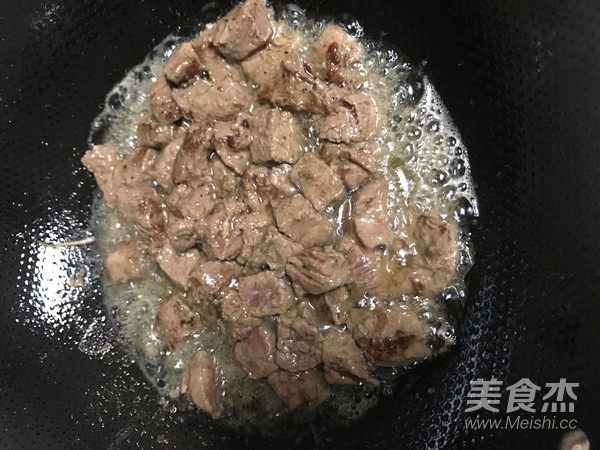 熱鍋起寬油,油量要比平時炒菜多一些哦,把牛肉粒倒進(jìn)鍋內(nèi),先不急著翻動,待其稍稍定型。