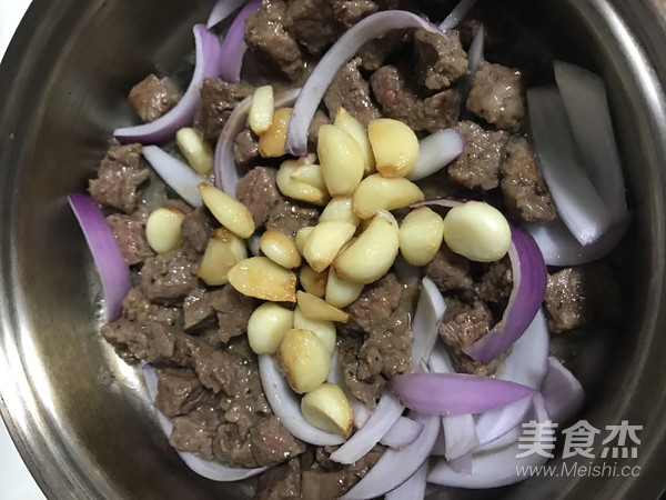倒入牛肉粒、蒜粒和洋蔥絲(切寬些)翻炒。